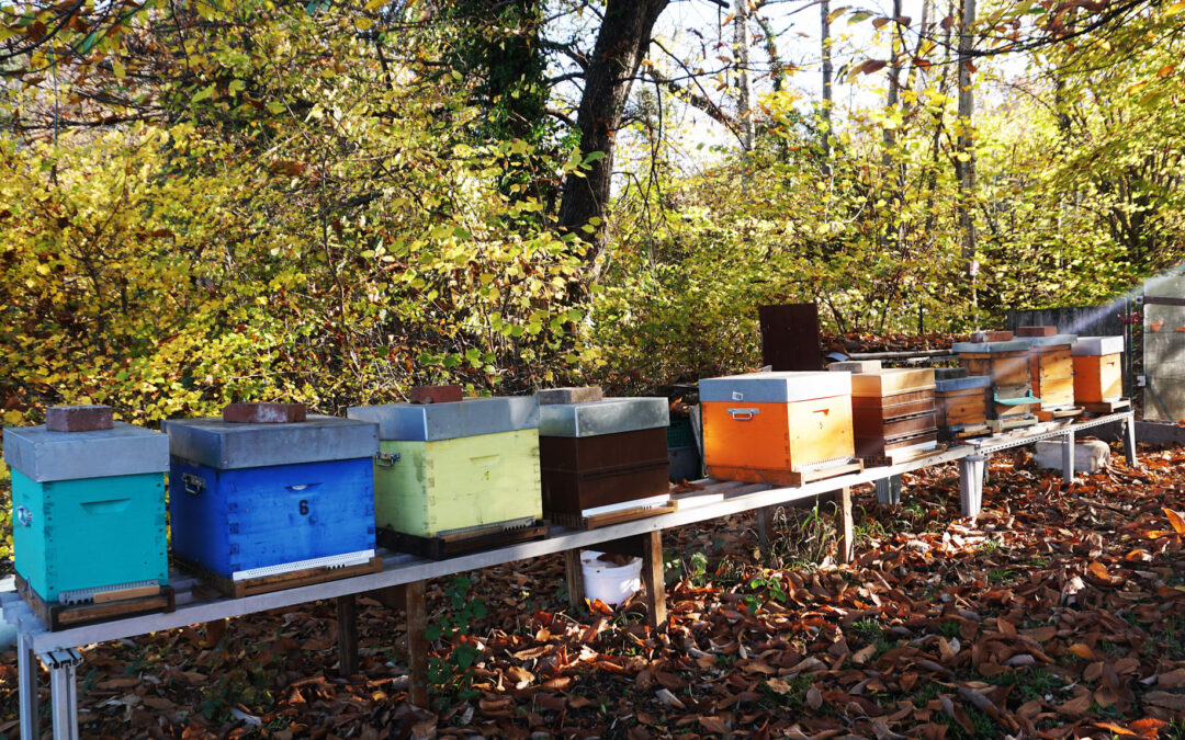 Notre rucher au mois de septembre 2025. Les frelons asiatiques à pattes jaunes sont très nombreux autour de nos ruches. J’ai construit trois harpes qui les électrocute. elles ont bien fonctionnées, plus des pièges sélectives.